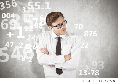 Composite image of young businessman thinking with arms crossed