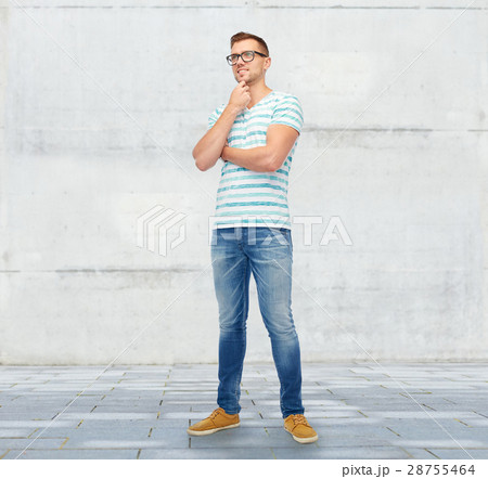 smiling young man in eyeglasses thinking