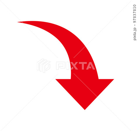 右肩下がりにカーブしている赤い矢印の手書きイラスト - シンプルな下落やダウンのイメージ素材