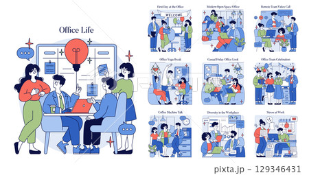 Vector illustration depicting various office life scenarios, focusing on teamwork, relaxation, and diverse work environments. Scenes include meetings, coffee breaks, and team celebrations.