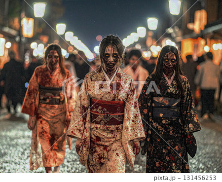 夜の京都の街を着物姿で徘徊する血まみれのゾンビ女性たち。ハロウィン和風ホラーシーン。