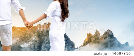 Young couple tourists traveling in the mountains