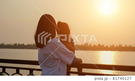 Mother holds little girl on railing on waterfront at sunset