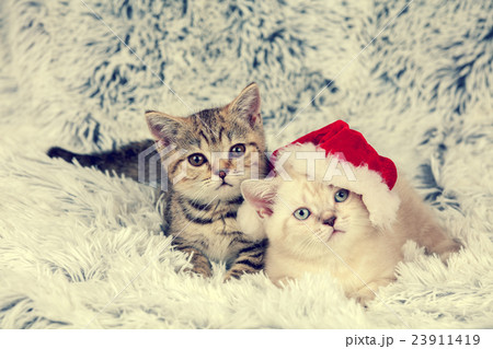 Two kittens wearing Santa hat lying on blanket