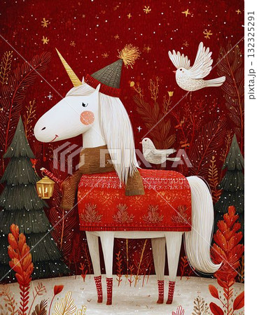 Whimsical Christmas Unicorn in Red Forest Magical Winter Holiday Illustration
