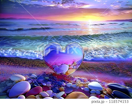 鮮やかな夕焼けのビーチに浮かぶクリスタルハート