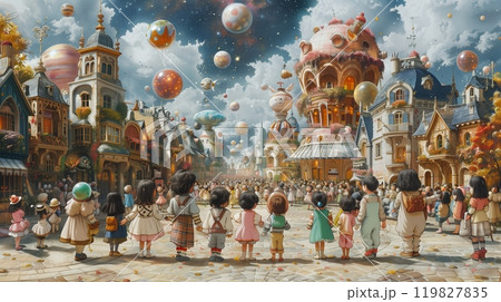 A Whimsical Parade in a Colorful Village With Children and Floating Balloons During Daytime