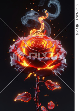 A red rose with flaming petals and smoke on a dark background. A conceptual image symbolizing passion, destruction, and emotion.