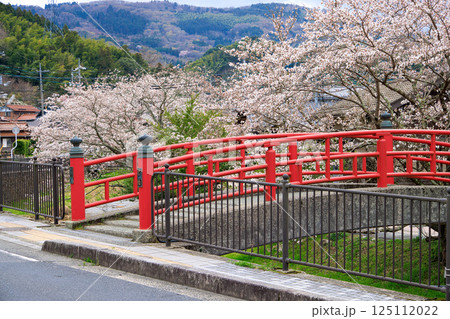 玉作湯神社の赤い橋 宮橋(恋叶い橋)桜の季節