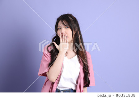 woman wearing casual purple t-shirt and shrugging shoulders, isolated on yellow background.