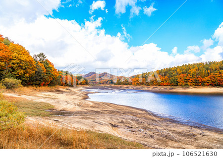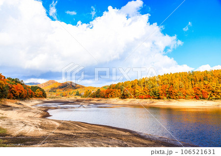 紅葉と湖と白い雲|恩原湖