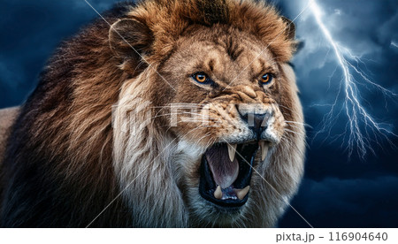 にらみつけ、ほえるライオン。雷雲と雷の背景。