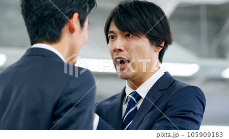 スーツ姿の男性に自動車に関したクレームをつけている男性
