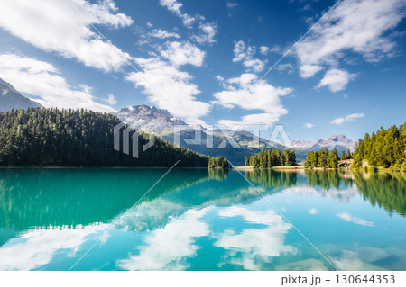 Great view of the azure pond Champfer. Location Swiss alps, Silvaplana village, district of Maloja, Europe.