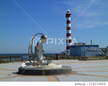ノシャップ岬漁港公園のイルカ像と稚内灯台