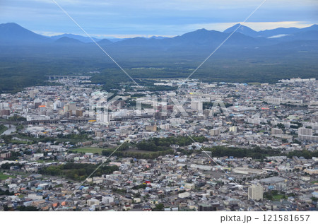 上空から西向きに見た千歳駅周辺の千歳市中心部