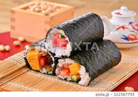 節分の恵方巻と福豆のイメージ。縁起物、厄除け、二月の行事。