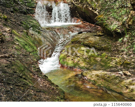 初夏の米子渓谷の新緑の木々と岩肌の絶景