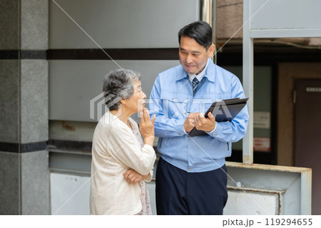 作業服の男性とシニア女性 点検