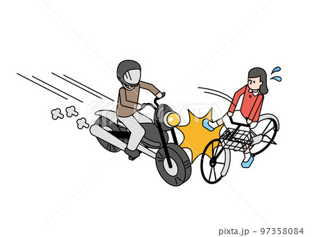 接触事故を起こすバイクの男性と自転車の女性のアイソメイラスト