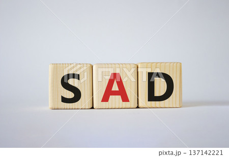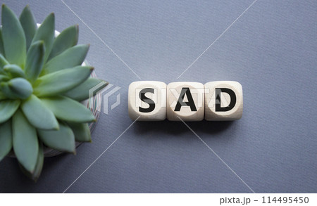 Sad - Seasonal Affective Disorder symbol. Wooden blocks with words Sad. Beautiful grey background. Business and Sad concept. Copy space.