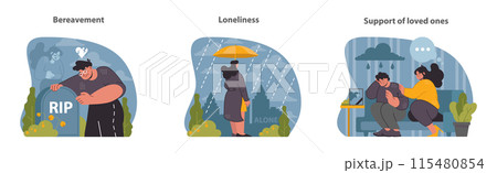 Widowhood journey set. Coping with loss, embracing solitude, and receiving compassion. Stages of grief visualized. Flat vector illustration.