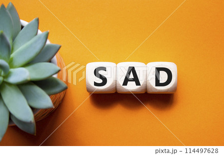 Sad symbol. Wooden cubes with words Sad. Beautiful orange background with succulent plant. Business and Sad concept. Copy space.