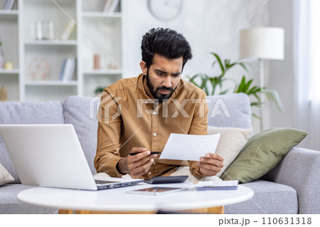 Upset Indian man sitting at home on the sofa near the table with documents and looking worriedly at the bills.