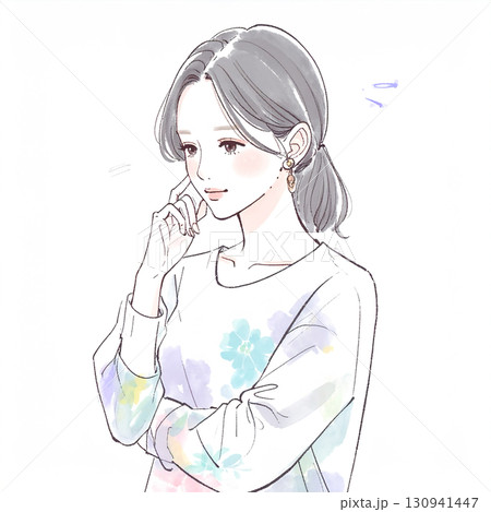 腕を組んで考える、悩む、落ち込む、不安みたいな水彩画・手描き風の女性・女の子のイラスト素材