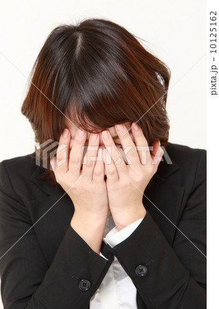 両手で顔を覆うスーツ姿の女性「AI生成画像」
