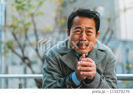 寒さで手に息を吹きかける50代サラリーマン