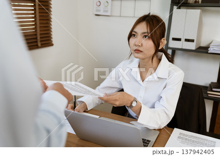 Angry boss and employee woman. Angry chief scolds his employee woman. Employee runs away from the angry director. Angry chief scolds his employee and points him get out from the office