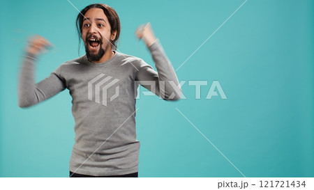 Man jumping from joy in excitement while cheering for favorite sports team, studio background. Person celebrating after victory, showing intense enthusiasm, supporting team during game, camera B