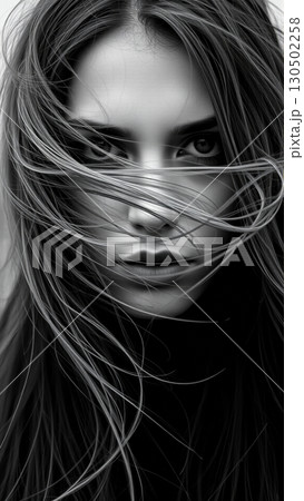 Monochrome portrait of a beautiful woman. Strong wind blows your hair