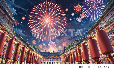 高層ビル群と市場の下で浮かぶ影法師たち - 都心絢爛漫画風景〜花火上がる、夏夜の暗黒舞台