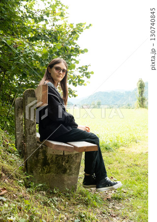 Teenage girl sitting on a bench in nature, Alps and meadows of Europe