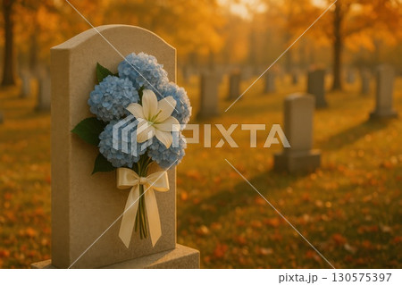 Elegant Gravestone with Floral Tribute Serene Cemetery Autumn Landscape Golden Hour Ambience