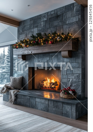 Lit fireplace with mantle and mantle with wreath of Christmas greenery in living room