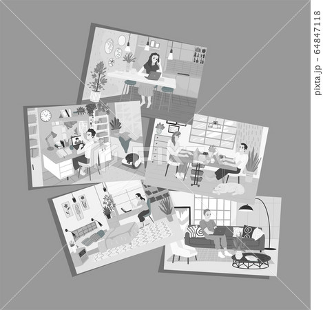 Photo frames, memories of working from home, studying online, quarantine pandemic of the coronovirus. Vector illustration