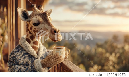 A surreal image of a giraffe in a bathrobe holding a coffee cup on a balcony with a scenic mountain view