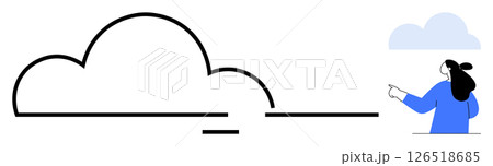 Woman wearing blue looks at and points to a large outlined cloud. Simplistic design with minimalistic background. Ideal for Computing, Weather Forecasting, Imagination, Dreams, Modern Art