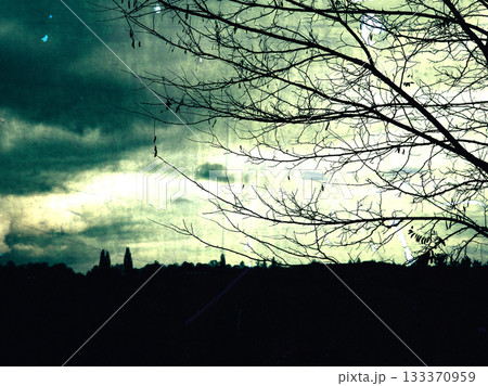 Dramatic sky and tree branches create a moody, atmospheric landscape scene. The silhouette of the tree branches against the sky