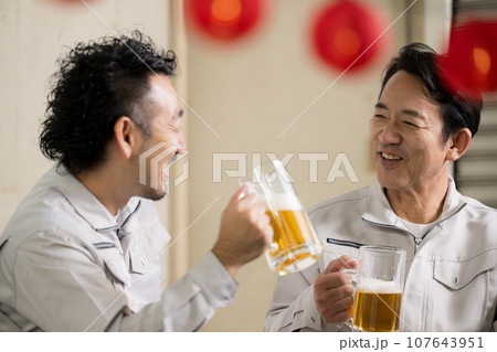 ビールで乾杯する作業員 お仕事お疲れ様~!!