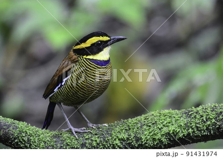 インドネシア・ジャワ島の国立公園のジャングルに住む黄色と黒のしま模様の美しいキマユシマヤイロチョウ