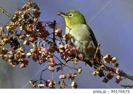 冬にマユミの木の実や寒桜を食べにやってくる、ウグイス色が美しい身近なかわいい小鳥メジロ