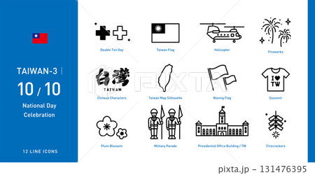 這組icon插畫以台灣國慶日為主題,如直升機、閱兵、煙火等慶祝元素。適合節日與祝福。向量可縮放與改色
