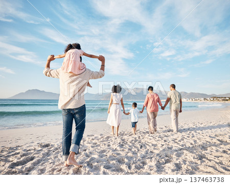 Big family, holiday and walking on beach, holding hands and piggy back on summer island sand from behind. Parents, grandparents and kids adventure on tropical vacation together at ocean in Hawaii.