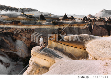 Couple in love in the mountains at sunset. Tourists on the tour. A couple in love travels to Turkey, Cappadocia. Man and woman at sunset. A couple in Goreme national Park, Cappadocia. Copy space