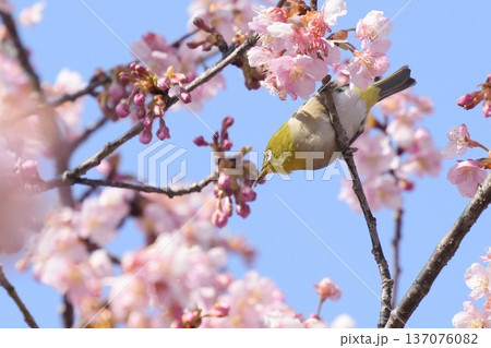 河津桜の枝にとまるかっこいいメジロと青空 春の風景
