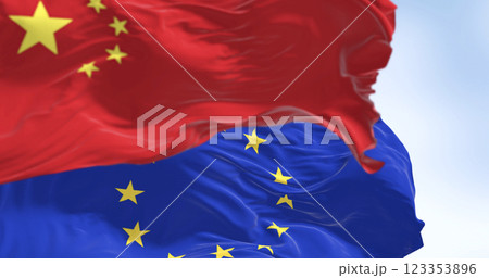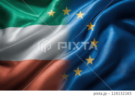 Two flags, Italys green, white, and red alongside the blue with stars of the European Union, flutter together, symbolizing unity and cooperation in Europe during a sunny day.